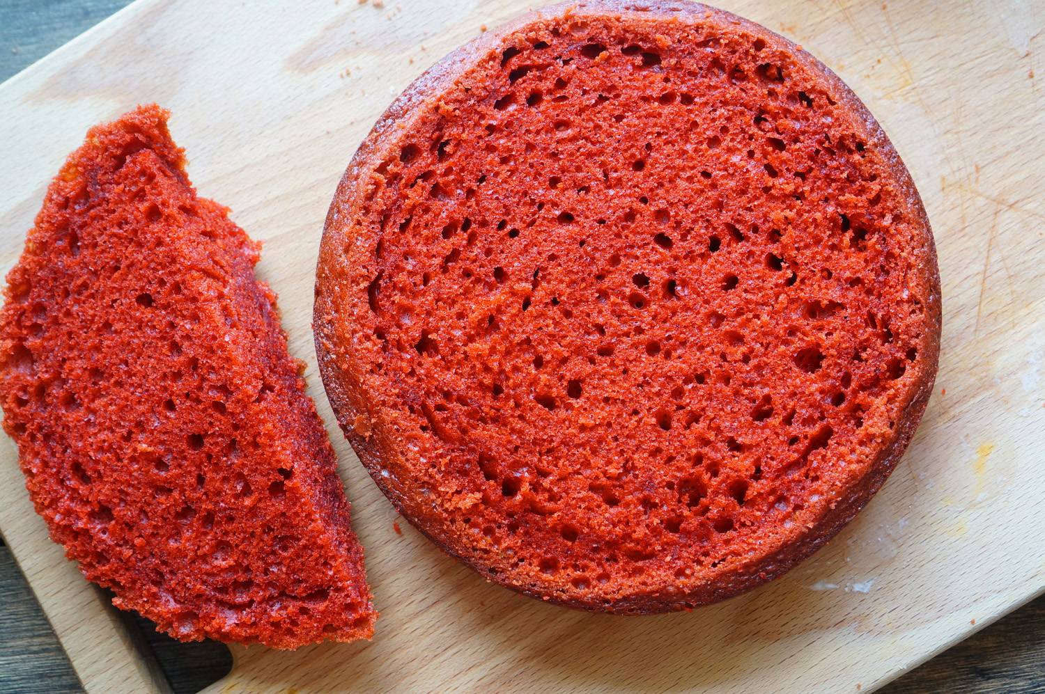 - Последней добавляем пахту с красителем. Если после того, как тесто перемешается до однородной консистенции, покажется, что красный цвет недостаточно интенсивый, добавьте еще немного пахты. На фото видно, какого цвета было у меня тесто и какого затем цвета стали коржи. Я выпекала каждый корж отдельно. Всего у меня получилось 4 коржа по 200 гр. Вы можете разделить тесто на две части и выпечь два больших коржа, которые затем надо разрезать пополам.