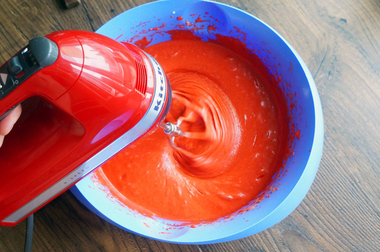 Сначала смешайте сухие ингредиенты — 475 г муки, 25 г какао-порошка, 10 г разрыхлителя, 4 г соды и 2 г соли. А теперь соедините и размешайте 365 г кефира и 10 г гелевого красителя.