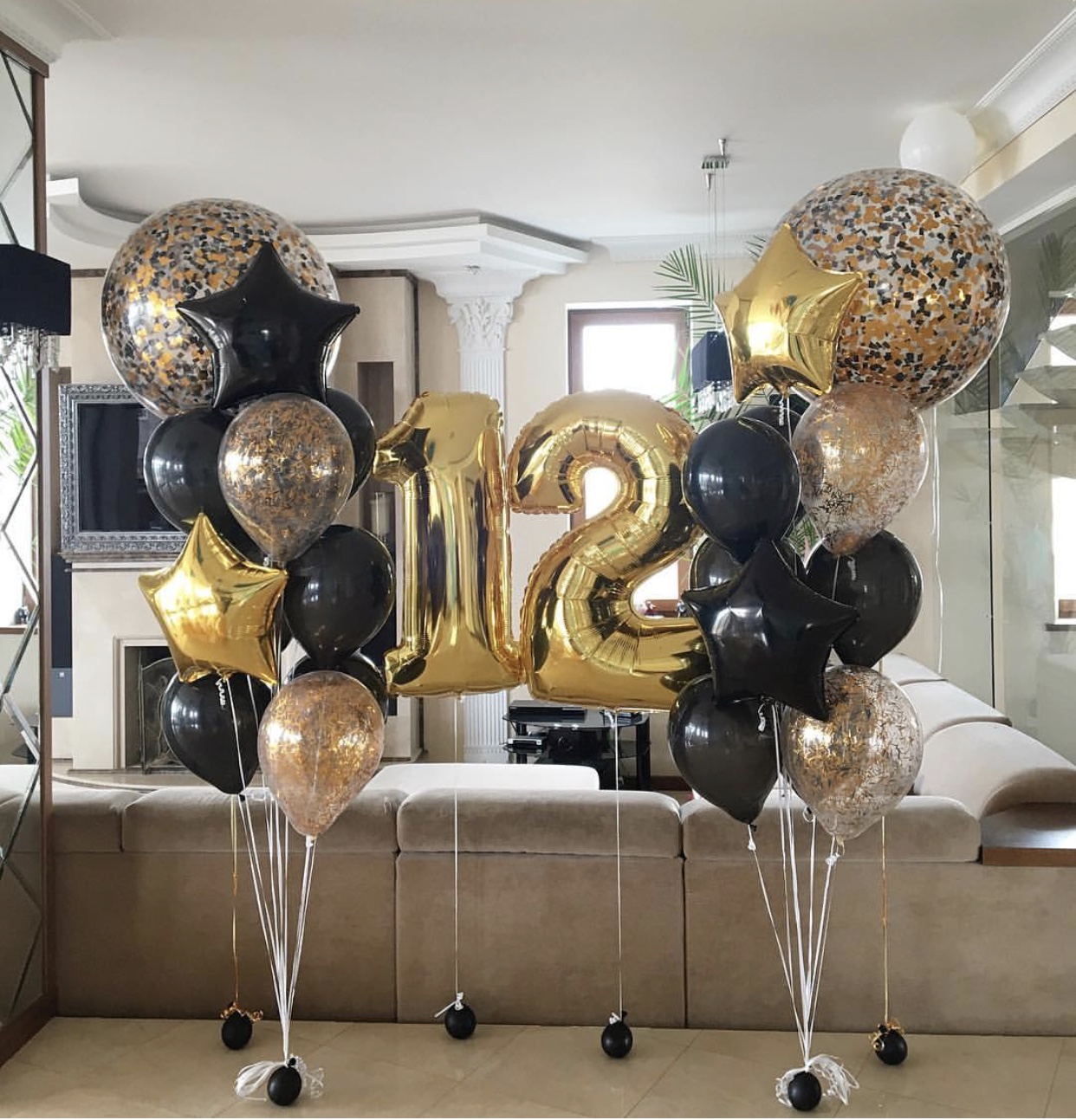 Композиции из нескольких шаров, связанных вместе, напоминают цветочные букеты и служат отличным дополнением к подаркам или самостоятельным украшением пространства. Их можно размещать на столах, возле сцены или в зоне для гостей. -