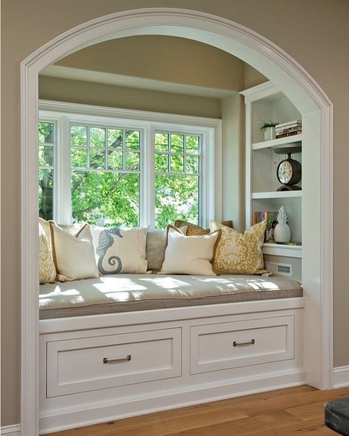 Чаще всего это встроенные конструкции, которые сооружаются на стадии отделки или ремонта помещения. Между шкафами обычно располагают скамью с мягким матрасиком. Удобно: взял книгу и тут же присел почитать возле окна.