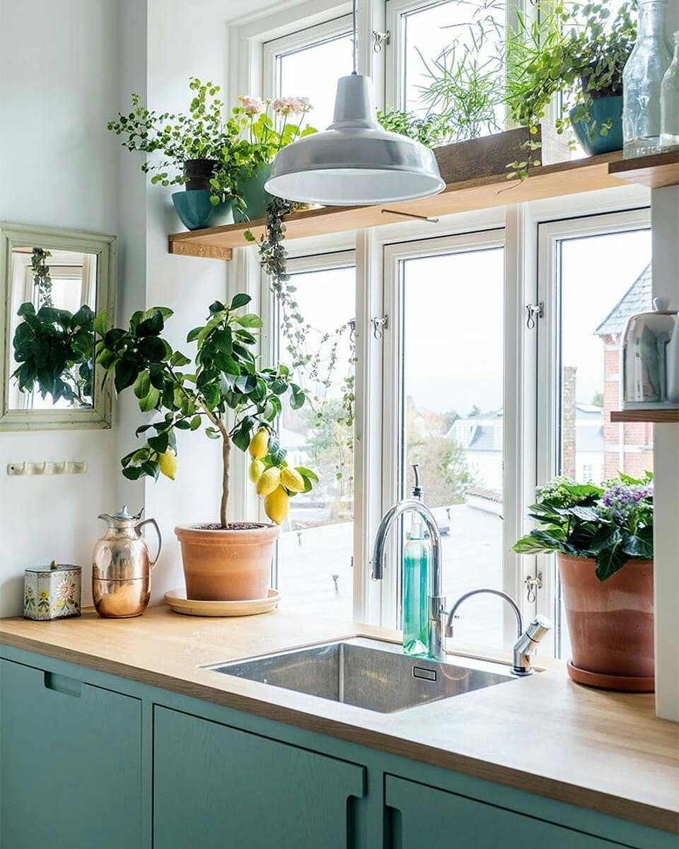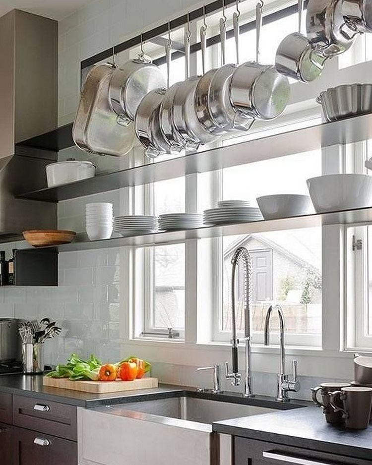 Окно на кухне – находка для хозяйки, мало того, что подоконник можно использовать в роли рабочей зоны, так ещё и задействовать пространство у окна. Организуйте открытые полки и поставьте туда посуду, кастрюли, крупы и специи в банках.