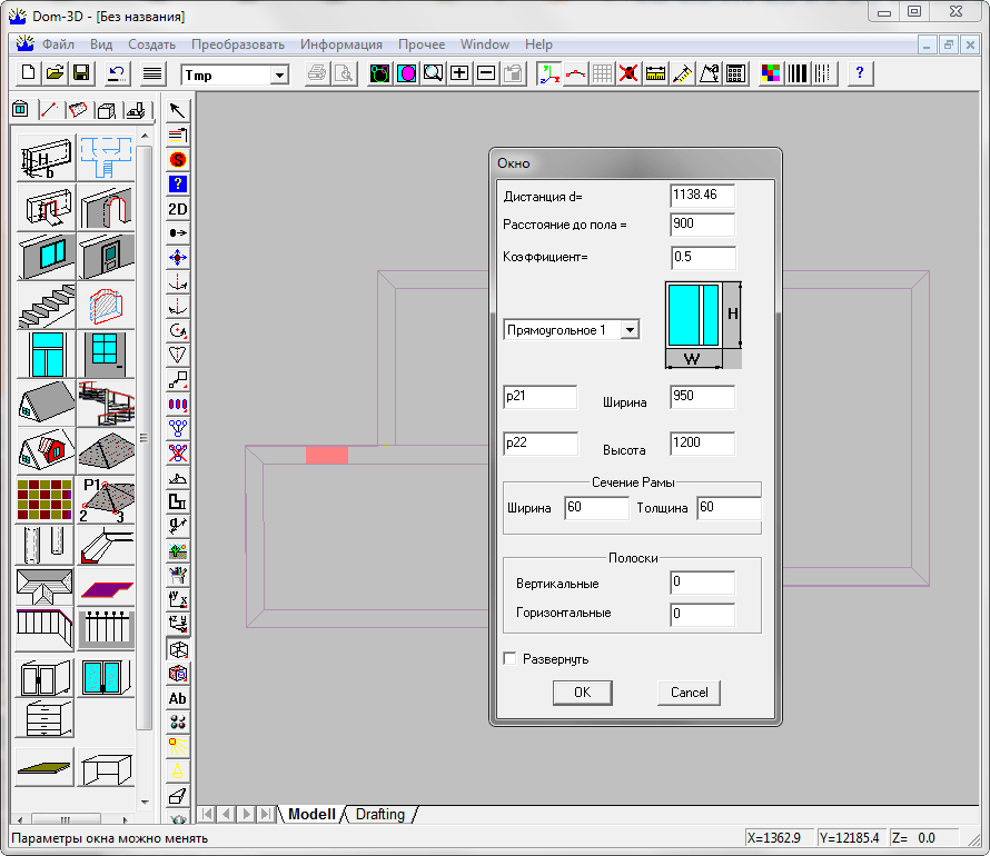 В процессе внесения изменений на плане, все они отображаются в окне внизу экрана. Там одновременно строится трехмерная модель. Это очень удобно, так как нет необходимости переходить из режима в режим и можно сразу вносить корректировки.