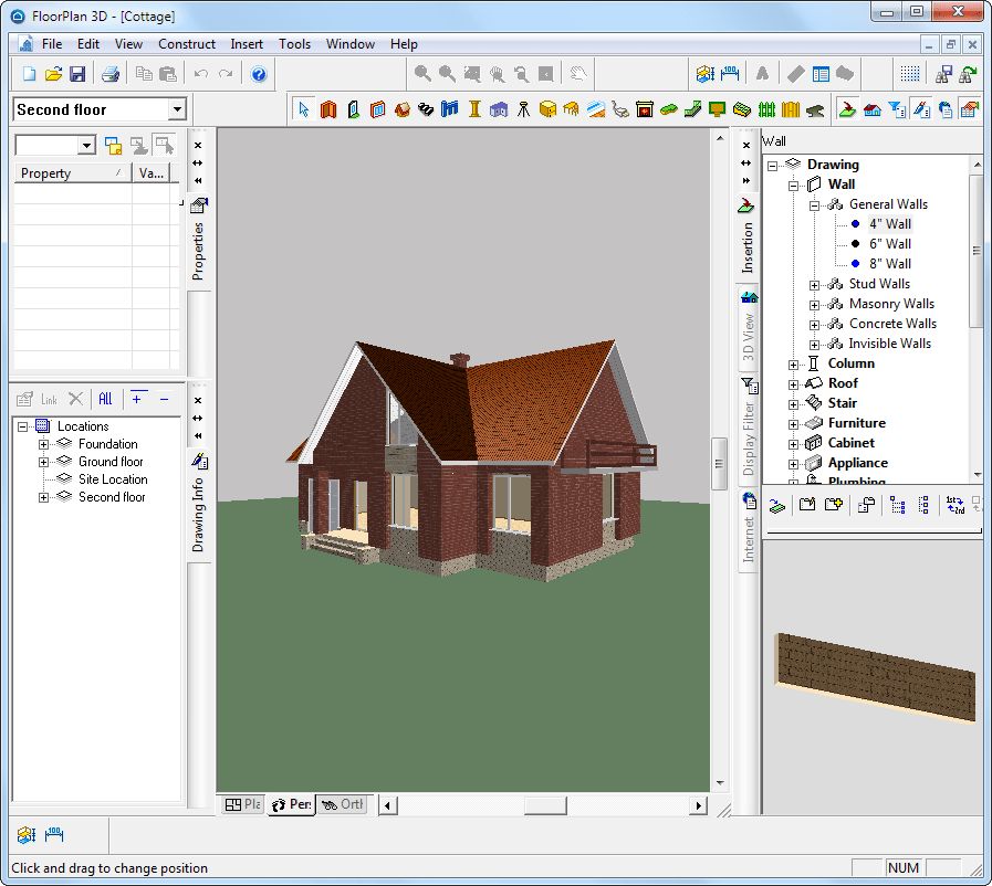 Программа FloorPlan3D позволяет создать трехмерную модель здания, рассчитать площади помещений и количество строительных материалов. В результате работы у пользователя должен получится эскиз, достаточный для того, чтобы определится с объемами строительства дома. FloorPlan3D не обладает такой гибкостью в работе, как Archicad, он имеет морально устаревший интерфейс и, местами, нелогичный алгоритм работы. При этом программа быстро устанавливается, позволяет быстро чертить несложные планы и автоматически создавать конструкции для простых объектов.