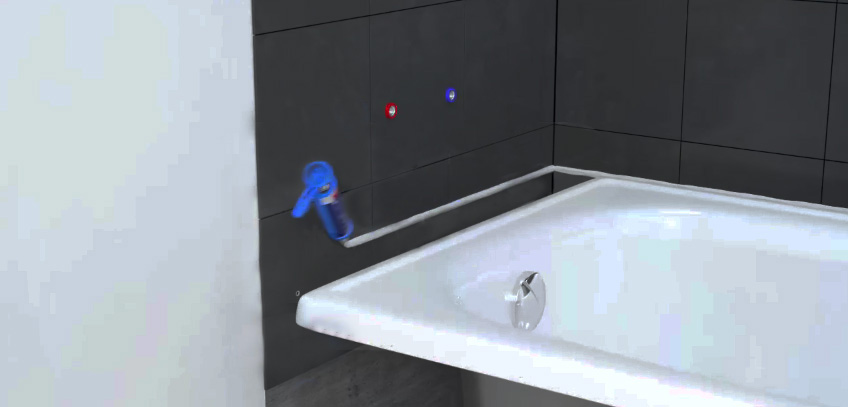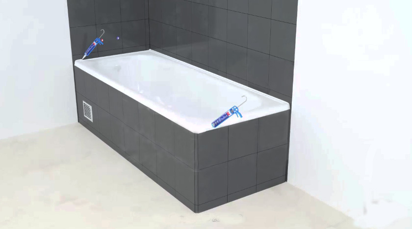 Шаг 9. По нарисованным линиям нанесите слой силиконового уплотнителя, установите ванну на подвесы. Толщина уплотнителя должна быть такой, чтобы закрывались все неровности плитки. Выдавленные излишки материала следует выровнять и удалить.