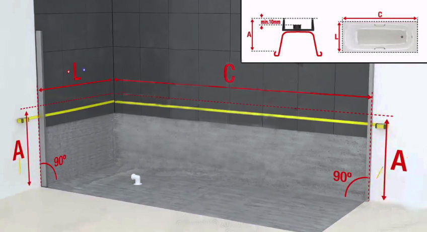 - Далее отметить контуры будущего основания. Для этого отвес прикладывают к краю ванны и отмечают точку на полу, позже их соединяют маркером.