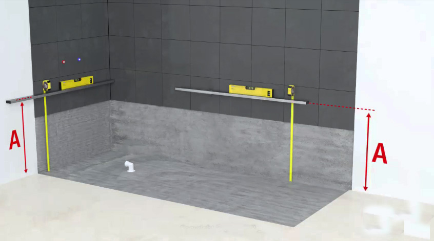 Шаг 7. На стенах помещения под уровень нарисуйте линии на высоте бортиков. Следите, чтобы все углы были под 90°.
