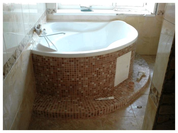 Каркас выполняется таких размеров, чтобы чаша ванны опиралась на него всеми гранями, но не проваливалась внутрь. Для упрочнения крепления, а также минимизации потери тепла, стоит воспользоваться монтажной пеной, заполнив ей все зазоры между каркасом и чашей купели. Монтируя каркас также нельзя забывать про уклон для слива воды. Конструкция декорируется любым удобным материалом: плиткой, панелями и выглядит достаточно эстетично.