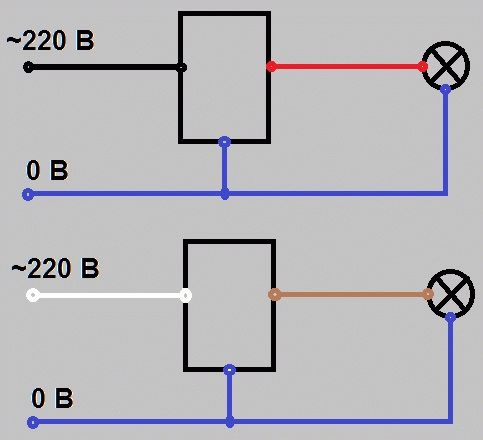 1. Три провода раскрашиваются красным, синим, черным. Первый используется для подачи фазы лампам, синий является схемной землей, черный подводит питание 230 вольт датчику движения. Природа снабдила другой раскраской: коричневый аналог красного, подает фазу на иллюминацию, синий считается землей, белый подводит 230 вольт датчику. Чтобы проще разобраться, рядом помещаем рисунок (для справки – подробнее читайте инструкцию), в цветах показан схематично расклад.
