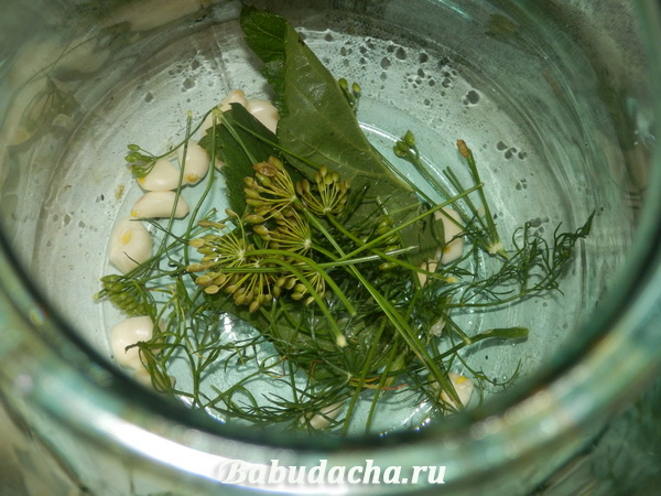 - На ведро воды – 600 г соли, 50 г укропа, 5 г эстрагона, половина стручка красного перца, 1 головка чеснока, половина корня хрена.