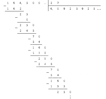 Сейчас хорошо видно, что начали повторяться остатки 25, 7 и 16, при этом в частном повторяются цифры 9, 2 и 5. Таким образом, деление десятичной дроби 164,5 на 27 приводит нас к периодической десятичной дроби 6,0(925).
