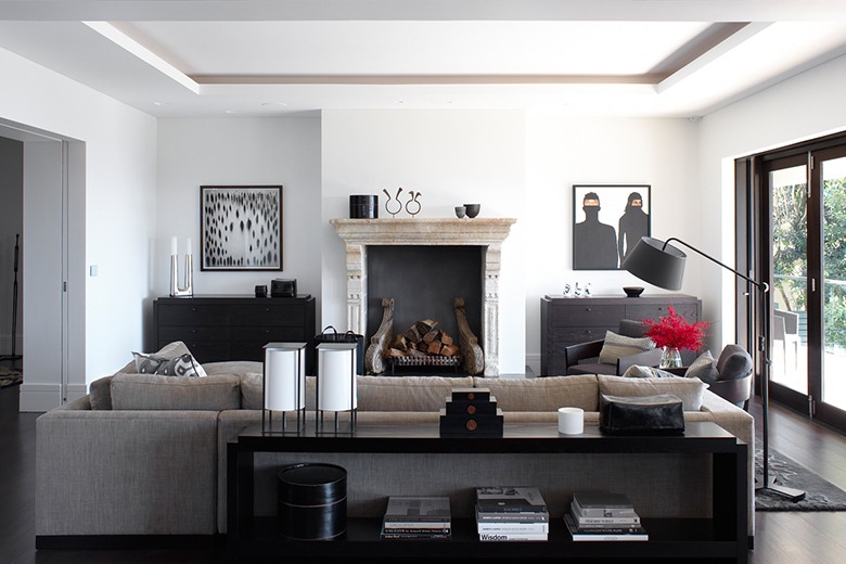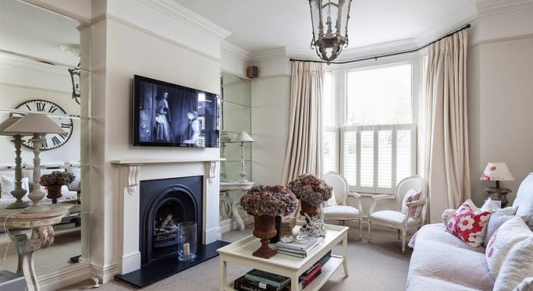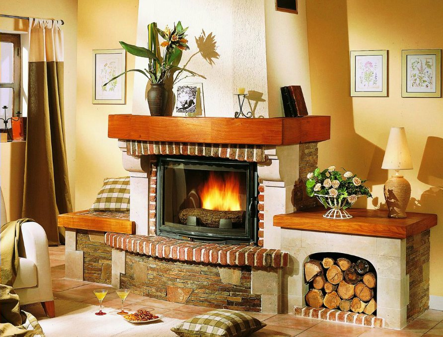 • Камин — настоящий, электрический или декоративный фальш-панель с соответствующей полкой, где в затейливом порядке выставлены разнообразные предметы (часы, статуэтки, свечи, цветы и пр.).