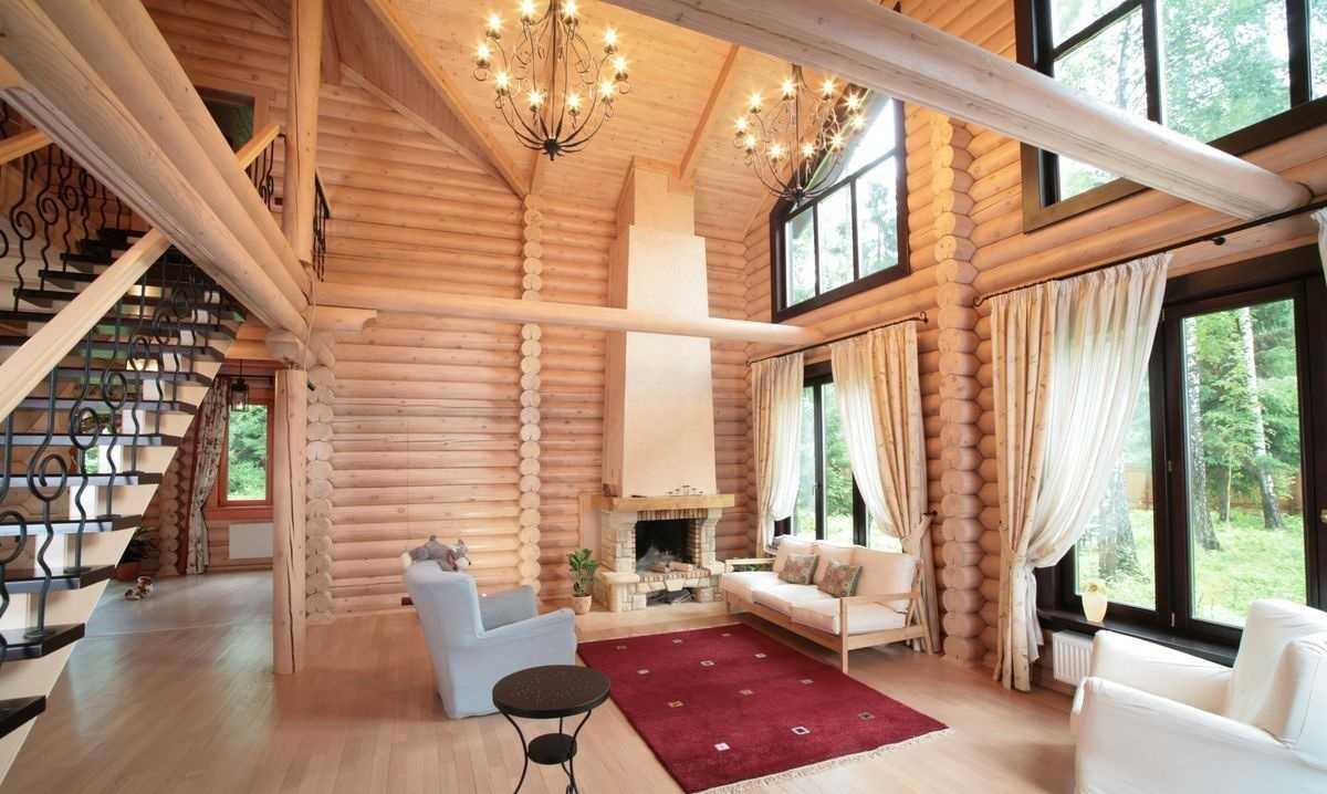 Деревянный интерьер придает домам особый характер. Может наблюдаться некая «неуклюжесть» отдельных предметов или отделочных материалов, таких как ручная роспись сундука, старинные часы или самовар. Природные материалы очень хорошо работают в этом типе интерьера: