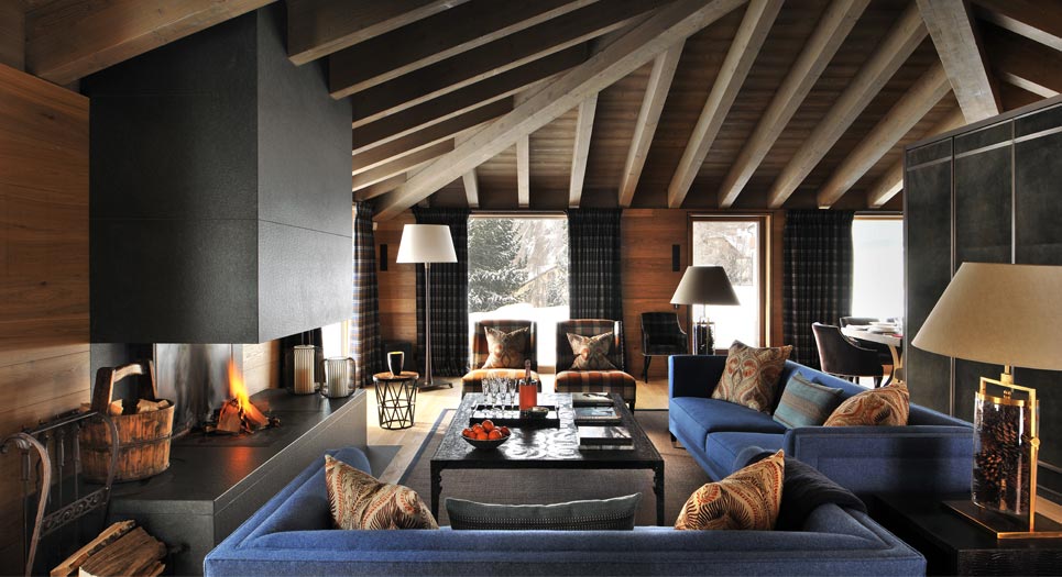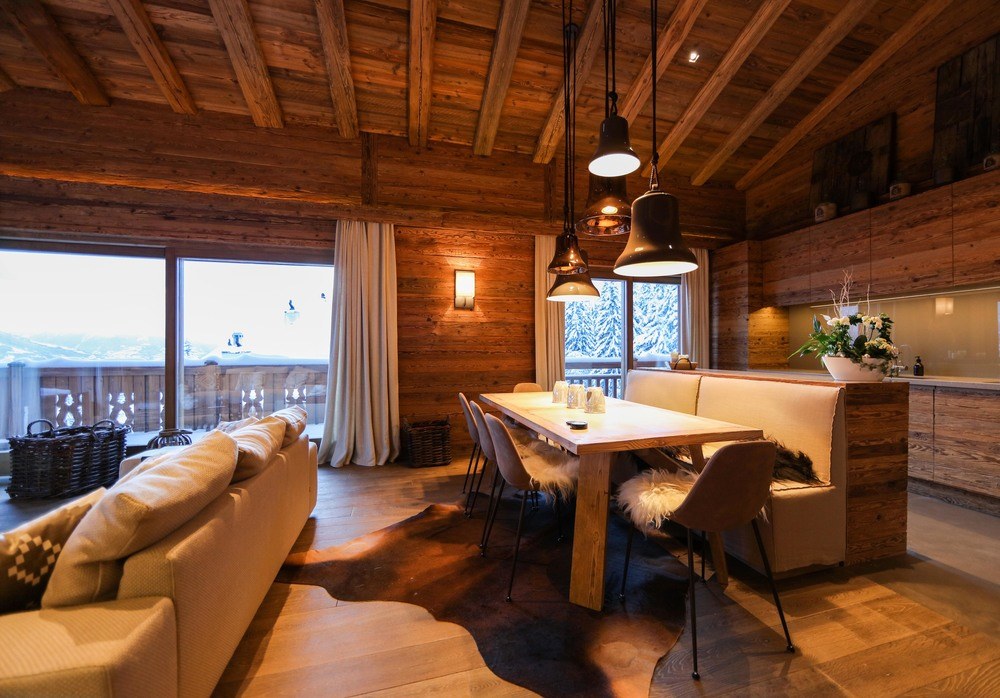 В интерьере часто используют необработанные материалы: некрашеные деревянные полы, стены отштукатуренные или облицованные деревом, но без окончательной отделки, выступающие потолочные балки, большой камин, грубо облицованный природным камнем. Все предметы в интерьере кажутся прочными, устойчивыми, массивными, надежными. Именно эти принципы стиля шале сделали его таким популярным при оформлении загородных домов.
