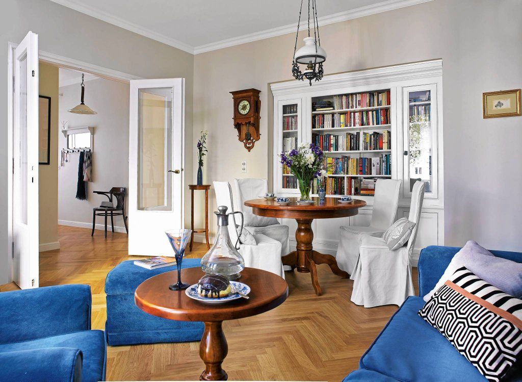 Главная примета — временные слои. Кажется, будто этот интерьер создавался шаг за шагом, каждое поколение приносило в него что-то свое: от бабушки — солидная библиотека и ретро-фотоаппарат, от мамы остался классический диван и стул известного дизайнера, а дочь выкрасила стену в оттенок бирюзы и повесила модный светильник…