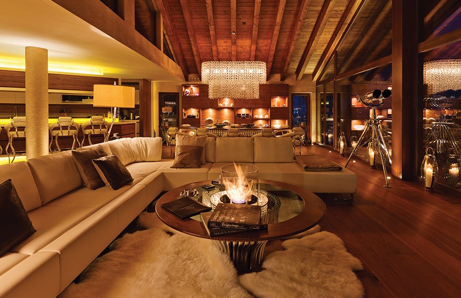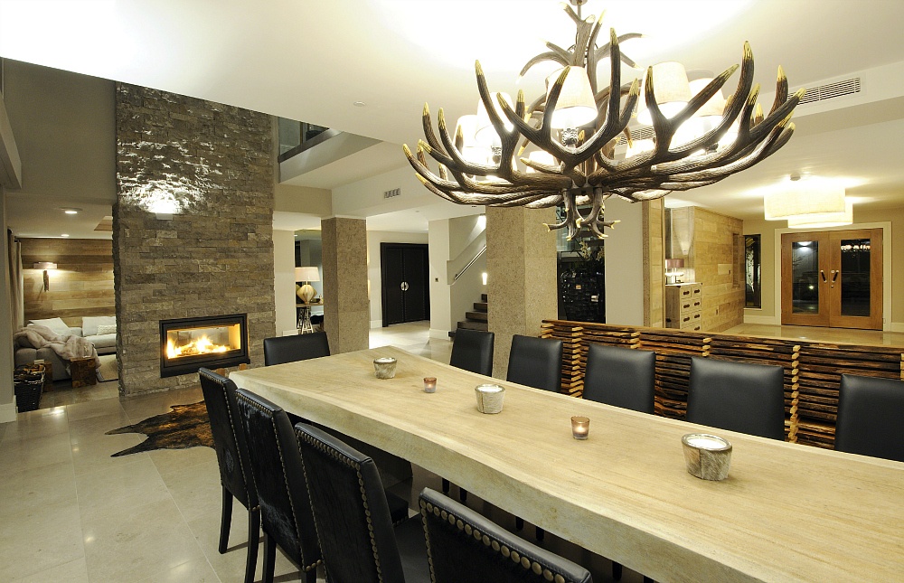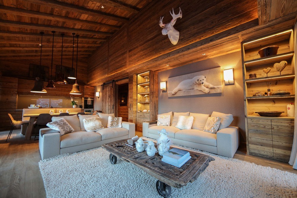 Представляя гостиную в доме, расположенном в горнолыжном курорте, на альпийских склонах, мы невольно склоняемся к стилистике охотничьего домика, но в более просторном помещении с обильным использованием деревянной и каменной отделки, чучелами животным на стенах и меховых шкурах на полах вместо ковров. И в этом представлении мы не далеки от воплощения альпийской стилистики в интерьерах гостиных.