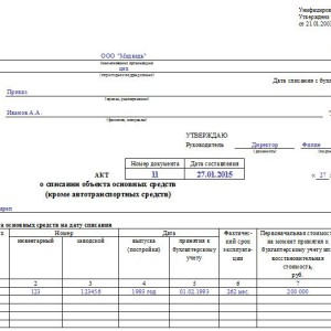 Когда проводится процедура списания основного средства, на данную процедуру комиссией составляется соответствующий акт, который обязательно утверждается и подписывается руководителем компании. Правильно оформленный акт списания передается сотрудникам бухгалтерии, которые на его основании формируют . Кроме того, на основании данного акта вносятся записи в на объект, которая будет храниться на предприятии в течение пяти лет.