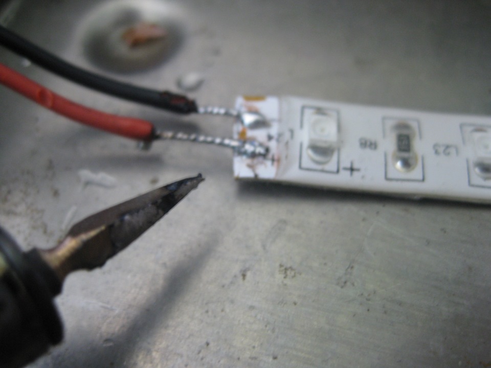 2. Осторожно припаивайте провода к лентам. Их пластиковая основа и сами светодиоды боятся перегрева. Лучше воспользоваться флюс-пастой для пайки, припоем ПОС-61 или аналогичным, с температурой плавления не выше 160 градусов, и паять «одним тычком». Если у вас нет большого опыта пайки мелких деталей, для пайки лучше пригласить мастера.