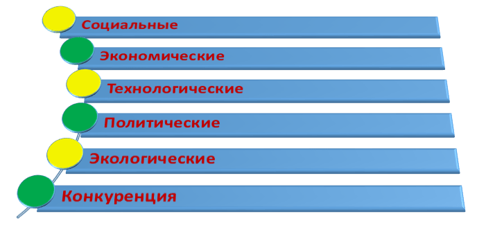 Сюда относятся внешние факторы, ситуации, формирующиеся за пределами фирмы, бизнес-окружение компании.