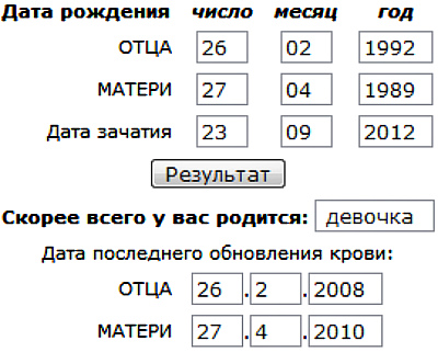 Расчет данных для определения пола ребенка основан нацикличности обновления крови мужчин и женщин в зависимости от даты их рождения.Термин обновление крови достаточно абстрактен и может быть опротестован,однако мне он кажется наиболее приемлемым в данном описании. Циклы обновления крови для мужчин и женщин различны исоставляют строго определенные периоды, начиная с их дней рождения. Позволю себе необнародовать эти данные и отнести их к Ноу-Хау (know-how). Предположив, что состояние крови изменяется от максимума -начала цикла, к минимуму — его концу, и совместив данные для мужчины и женщины, можно найтиопределенную зависимость и ввести новый термин — Сила крови или Молодостькрови, характеризующий данную зависимость. Именно этот параметр и определяет полбудущего ребенка — т.е. чья кровь сильнее (или моложе), та кровь и превалирует,предопределяя пол будущего ребенка. Параметр Сила крови строго привязан к датам, что позволяет, сбольшой точностью, вычислить вероятность появления ребенка того или иного пола, налюбую дату в году.