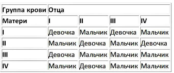 Таблица определения пола ребенка по резус-фактору матери и отца