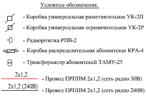 - Абонентская распределительная проводная сеть. Набор проводов, проложенных внутри здания, и радиорозеток. Предназначена для передачи усиленного звукового сигнала к абонентам.