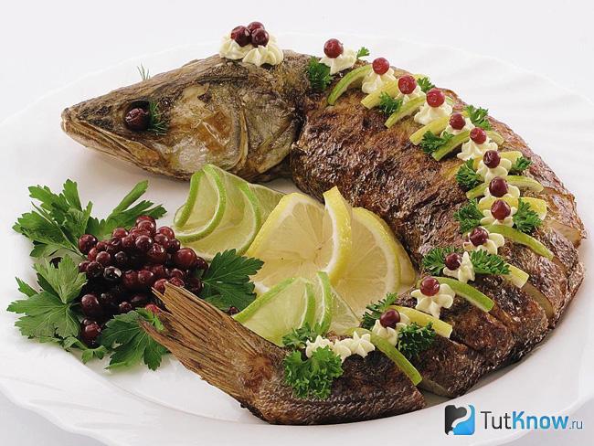 Фарширована щука, рецепт которой не так уж сложен, прекрасно подходит для праздничного стола. Поэтому стоит позаботиться и о внешнем виде блюда. Пригодится майонез: если нарисовать сеточку на почти готовой рыбе и вернуть ее в духовку на пару минут, получится очень красиво. Хорошо подходят к печеной рыбе и листья салата, шпината, латука. «Идут» ей также красные ягоды, например, клюква, калина. Можно использовать половинки долек лимона.