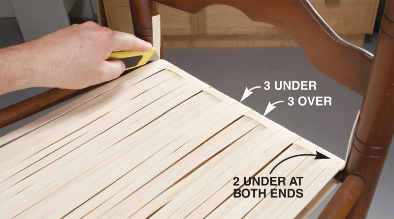 Убедиться, что все ряды тростника лежат в той же плоскости, можно, протерев сиденье деревянным бруском. Если потребуется, вставьте между прядями на нижней стороне стула дополнительную картонную набивку. Для этого используйте жесткую деревянную линейку.