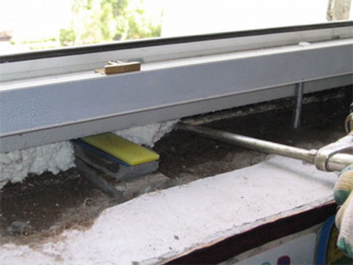 - уровень выравнивается при помощи специальных подкладок, после чего пространство под подоконником задувается пеной или заполняется раствором.