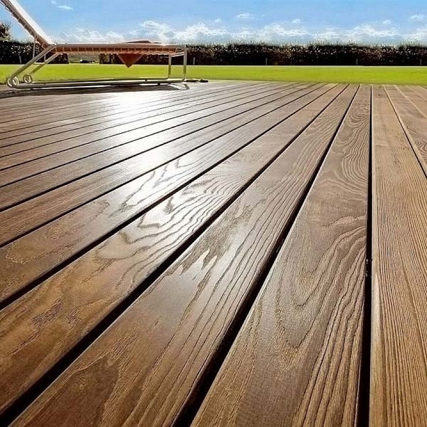 Лиственница — хвойная порода дерева, известная своей устойчивостью к влаге и перепадам температуры. Основные плюсы: долговечность (срок службы до 30 лет), естественная защита от гниения благодаря смоле, экологичность (без химической обработки). Она не скользит, даже когда мокрая, и имеет красивый рисунок волокон. Идеальна для климата с дождями и снегом, сохраняет тепло и комфорт под ногами. Кроме того, она доступна по цене по сравнению с экзотическими породами.