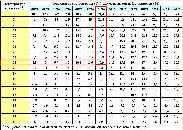 Например, для помещения нормальными показателями является влажность 60% и комнатная температура 21 o C, расчет будет выглядеть следующим образом: