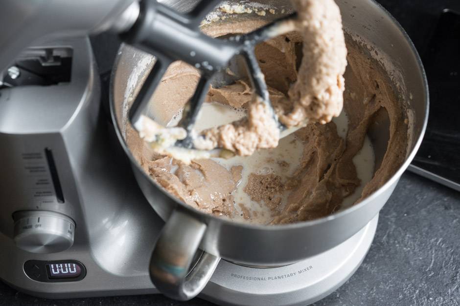 - Просеиваем через сито муку, какао, соль, хорошо перемешиваем;