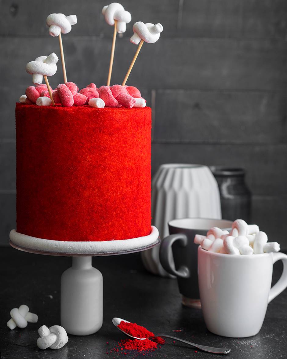 Существуют тысячи рецептов. Путём экспериментов, я нашёл свой. Все его достоинства можно почитать в моём посте . Если совсем коротко — это настоящее американское блаженство. Благородный торт, который фантастическим образом влюбляет в себя любого. Нежное рыхлое тесто, которое будет таять во рту и при этом идеально подружится с сырным кремом. Оно даёт возможность наслаждаться сладким десертом, а в конце получить шоколадное вознаграждение. Пожалуй, это идеальный компромисс для двух лагерей: ярых противников шоколада и безвольных шокоголиков, таких, как я. Чтобы довести идею до конца, я использую обрезки, создавая бархатное покрытие на торте, так он по праву может называться красным бархатом не только за внутренний мир, но и за безупречную внешность. Броский, яркий и очень аппетитный, он говорит: «Держись подальше, со мной ты можешь навсегда потерять голову». Вдобавок, я расскажу, как приготовить декор — ещё одну американскую классику — узелки из маршмеллоу.
