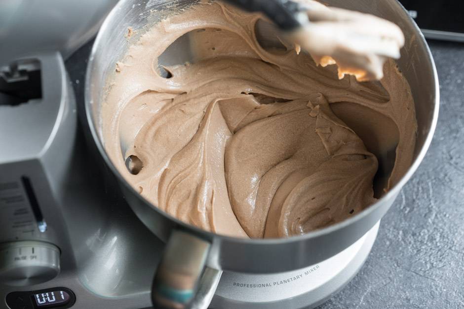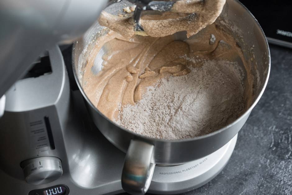 Попутно смешайте в отдельной чаше сухие ингредиенты будущего теста: муку (365 г), разрыхлитель (10 г) и алкализированное какао (10 г). Используйте венчик или даже миксер, чтобы масса стала максимально однородной.