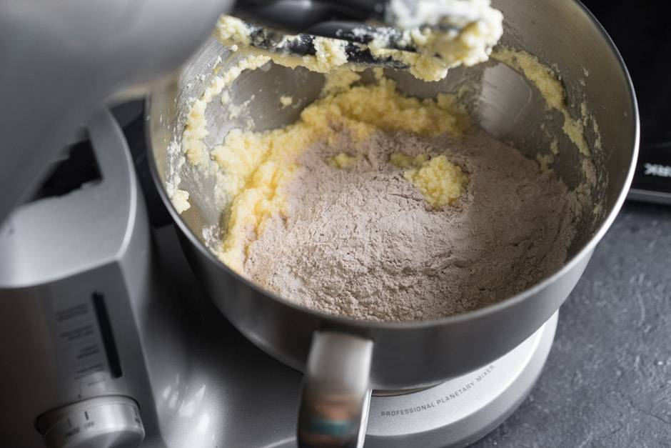Прежде всего промешайте хорошее сливочное масло 82,5% (220 г) и сахар (395 г) в чаше миксера. Масло должно быть мягким. Причём, будет хорошо, если вы достанете его из холодильника и используете сразу в тот момент, когда оно стало мягким.