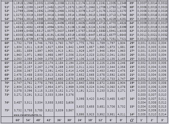Найдем обозначение sin (обозначение в столбце с левого края) 42 минут (обозначение находится на верхней строчке). Путем пересечения ищем обозначение, оно = 0,3040.Величины минут указаны с промежутком в шесть минут, как быть если нужное нам значение попадет именно в этот промежуток. Возьмем 44 минуты, а в таблице есть только 42. Берем за основу 42 и воспользуемся добавочными столбцами в правой стороне, берем 2 поправку и добавляем к 0,3040 + 0,0006 получаем 0,3046.При sin 47 мин, берем за основу 48 мин и отнимаем от нее 1 поправку, т.е 0,3057 — 0,0003 = 0,3054При вычислении cos работаем аналогично sin только за основу берем нижнюю строку таблицы. К примеру cos 20 0 = 0.9397Значения tg угла до 90 0 и cot малого угла, верны и поправок в них нет. К примеру, найти tg 78 0 37мин = 4,967
