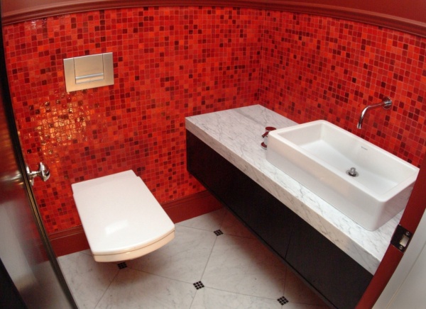 Яркий и сочный цвет. Его оттенки могут быть весьма разнообразны — от теплых и до холодных. В маленьком туалете его рекомендуется использовать только в качестве основного цвета. Небольшие вставки из рисунков и орнаментов данного цвета будут неуместны. Дл примера можно предложить следующие варианты отделки: