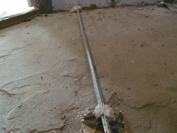 Самый распространенный способ — это выставление маяков при помощи гидравлического уровня. Находится крайняя нижняя точка, к которой привязывается начало первого маячка. От него вдоль стены, на расстоянии не более 50 см устанавливается металлический маячок. Закрепляется он на раствор бетона с таким расчетом, чтобы после заливки и высыхания всей плоскости пола его можно было удалить, а образовавшийся раскол зашпаклевать. Далее на расстоянии 1,5 м, соблюдая горизонтальность, выставляются последующие маячки вплоть до противоположной стены. Расстояние между последним элементом и стеной не должно превышать 50 см.