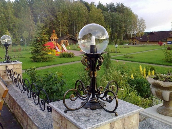 Создать общую гармонию ограждения позволит украшение забора дачи коваными элементами. Продолжая выбранную тематику, кованые украшения применяют для освещения участка.