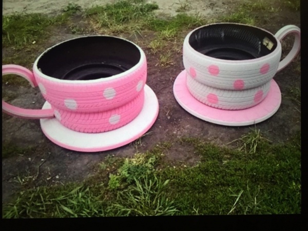 Представителей фауны можно изготовить не только из пластика. Старая резина — прекрасная заготовка для утонченных лебедей, играющих роль клумбы. С этой же целью из шин формируют огромную кружку, одновременно служащую украшением и вместительным цветником.