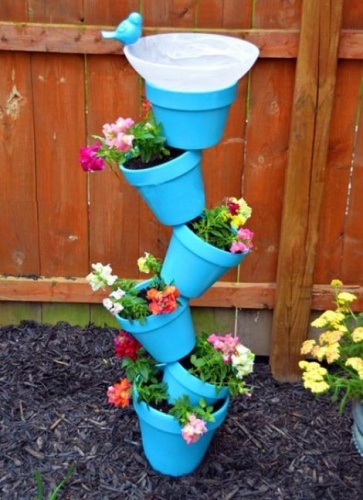 Помимо бутылок, подручным материалом в ландшафтном дизайне дачи могут стать обыкновенные пластиковые стаканчики. Главное — дать волю своей фантазии, и идеи не заставят себя долго ждать. Даже самые стандартные емкости в виде цветочных горшков можно соединить нетрадиционным способом и получить оригинальное украшение в качестве цветника.