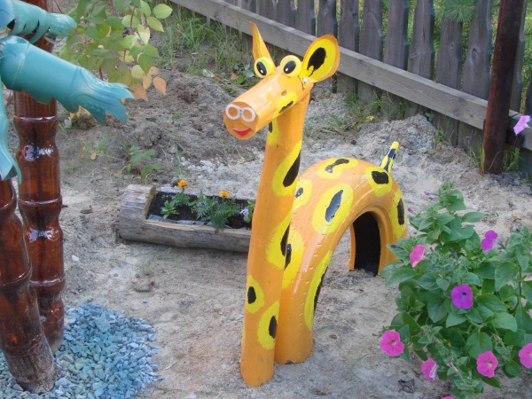 Творческие натуры имеют безграничную фантазию. Отслужившие свой срок шины, после несложных манипуляций могут превратиться в интересные украшения для дачи. Будь то яркое солнышко или экзотический жираф.