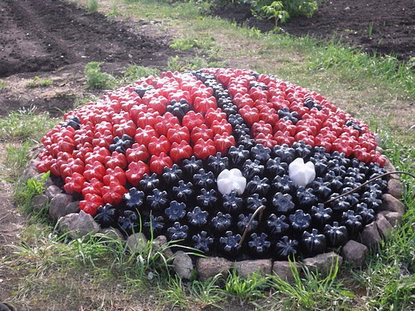 Ярким украшением в ландшафтном дизайне может стать гигантская божья коровка, выложенная из отрезанных донышек пластиковых бутылок. Своеобразный белый шар, увенчанный искусственными цветами — еще один вариант украшения участка.