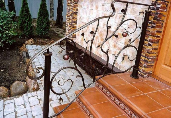 Заключительная ступень ландшафтного дизайна — вход в дом. Элементы ограждения крыльца и декор козырька — еще один вариант применить кованые детали в качестве украшения. Трудоемкий процесс по созданию кованых деталей окупится их долговременной эксплуатацией и неповторимым дизайном дачи, поражающим присутствующих своей эксклюзивностью.