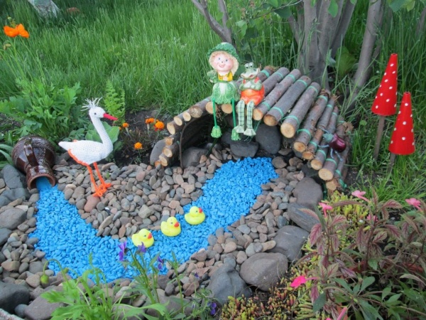 Недостаток инженерных знаний не является преградой для оборудования на даче самобытного уголка. В одном украшении можно соединить все предлагаемые способы декора ландшафтного дизайна. Имитация ручейка из камней, деревянный мостик, пластиковые фигурки — все зависит от границ ваших фантазий.