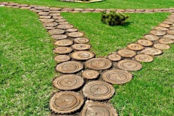 Прекрасная и очень удобная дорожка может получиться из бревен березы. Данные бревна просто распиливаются на кружки, которые не должны быть слишком тонкие. После чего, кружками выкладывается дорожка. Результат будет очень красивым, а тропинка будет сложить вам долгое время.