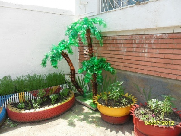 Комплект коричневых и зеленых бутылок позволяет соорудить пальму и оборудовать в ландшафтном дизайне дачи экзотический уголок. Наиболее гармонично она смотрится возле клумбы или бассейна.