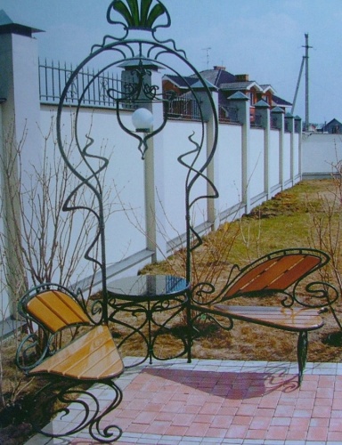Уютная лавочка с коваными элементами позволит предаться философским размышлениям, а оригинальная крыша защитит на даче от палящего солнца или летнего дождика.