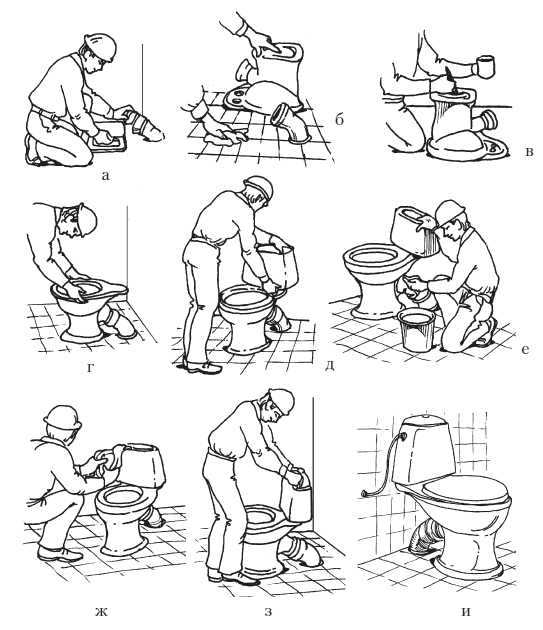 Установка унитаза: а – подготовка места установки; б – подготовка основания; в – обмазывание клеем днища унитаза; г – установка унитаза; д – установка бачка; е – заделка раструба; ж – присоединение бачка к водопроводной сети; з – регулировка уровня воды в бачке; и — полностью установленный унитаз