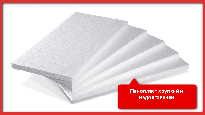 Пенопласт – материал очень ломкий, поэтому подходит только для обшивки ровных поверхностей. При его монтаже используются анкеры, что нарушает целостность основания, кроме того, в месте крепления и на стыках листов образовываются точки росы. Материал этот легко воспламеняется и при горении выделяет крайне токсичные вещества, поэтому в некоторых помещениях его запрещено использовать правилами пожарной безопасности.
