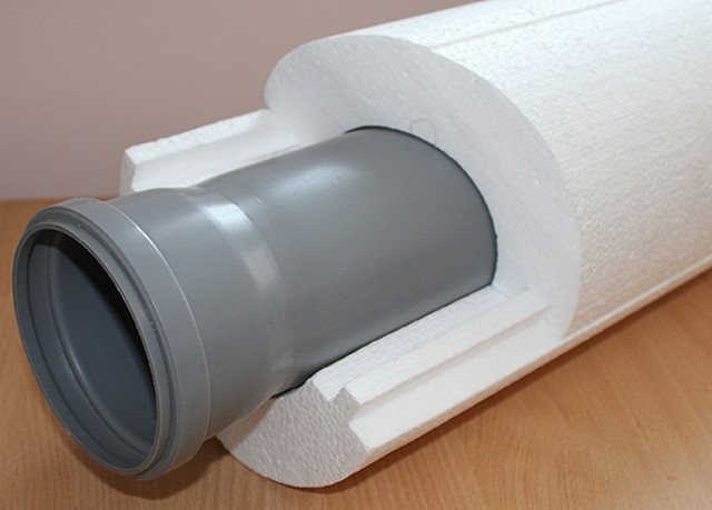 - пенопласт или полистирол – разборные цилиндры. Этот материал выпускается разного калибра, где внутренний диаметр должен в точности повторять наружный диаметр трубы. На этом утеплителе есть специальная замковая система паз-шип, которая собирается по типу скорлупы;
